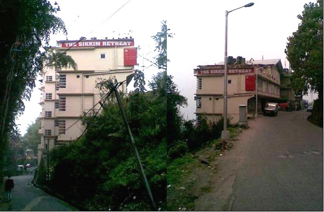 आम्ही ज्या हॉटेलात उतरलो होतो त्या सिक्कीम रिट्रीट हॉटेलचे प्रवेशद्वार डॉ.आंबेडकर रस्त्यावर तळ मजल्यावर आहे. प्रवेशाशी उभे राहून हॉटेलकडे पाहिले असता ते दोन मजली भासते. आम्ही ज्या खोलीत राहिलो होतो त्या खोलीत जाण्याकरता स्वागत-कक्षापासून एक मजला खाली जावे लागे. खोलीतील खिडकीतून एक रस्ता दिसे. तो हॉटेलच्या पाठीमागचाच रस्ता होता. मात्र मी त्या रस्त्यावर जाऊन पाहिले तेव्हा आमची खोली दुसर्या मजल्यावर दिसत होती. इथे सर्वसाधारणपणे सर्वच घरांचे बांधकाम असेच असे.