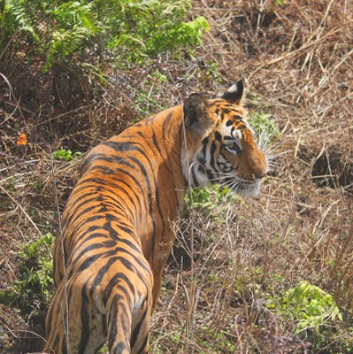 तर आम्ही हत्तीवर बसलो. अन हत्तीने झाडाझुडपातून वाट काढत आगेकुच केले. माहूत झाडांच्या फांद्या बाजूला करत होता अन आम्हाला ही तसे करायला गाईड करत होता. आम्ही उत्सुकतेने इकडे तिकडे बघत होतो. आमचे नशीब फार जोरावर होते. इतका वेळ एका ठिकाणी बसलेली वाघिण थोडी पुढे निघाली होती. आमच्या समोर अगदी दहा फुटावर ती आम्हाला पाठमोरी दिसली ती अशी,