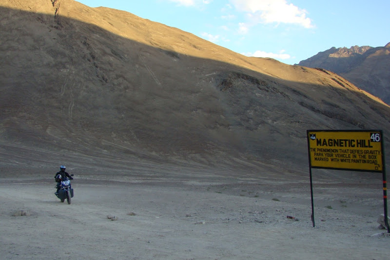 आता थेट 'मॅग्नेटिक हिल'ला पोचलो. इकडे रस्त्याच्या मधोमध एक चौकोन काढला आहे. त्यात गाडी उभी केली की मॅग्नेटिक इफेक्ट जाणवतो म्हणे. वेगाने जाणाऱ्या गाडीचा स्पिड सुद्धा कमी होतो, एक्सेलरेट केली तरी गाडी पळत नाही असे ऐकले होते. असे काहीसे आमच्यासोबत येताना झाले होते. कुलदीपने तर चौकोनामध्ये स्वतः उभे राहून उड्या मारून पाहिल्या. मी म्हटले 'तुझ्या अंगात काय मेटल आहे का?' आदित्यला बाईकवर इफेक्ट जाणवत होता मला मात्र तेंव्हा अजिबात जाणवला नाही.म्हणुन मग मी बाईक रस्त्यावरुन खाली टाकली आणि अक्षरश: त्या 'हिल'वरती जिथपर्यंत बाईक जाईल तिथपर्यंत नेली. चढवताना मज्जा आली पण जशी ती चढायची थांबली तशी फिरवताना मात्र लागली बरोबर. कशीबशी न पड़ता फिरवली आणि सुसाट वेगाने उतरायला लागलो. अर्धातास तिकडेच नव-नवीन प्रयोग करत होतो आम्ही. जसा अंधार पडत आला तसे आम्ही तिकडून निघालो. परतीच्या वाटेवर अतिशय सुंदर असा सूर्यास्त आम्हाला बघायला मिळाला. डोंगर, सूर्यकिरणे आणि ढग यांचा सुंदर मिलाफ.