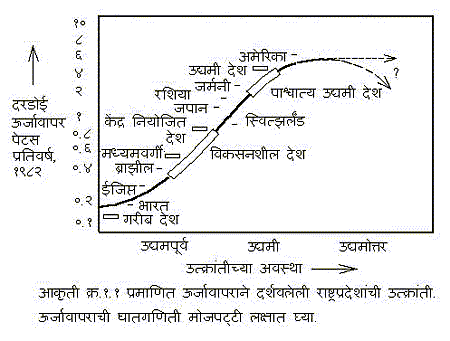 ह्या प्रकरणात आतापर्यंत जे अनेक प्रश्न चर्चिले वा उल्लेखिलेले आहेत ते आकृती क्र.१.१ मध्ये दर्शविलेल्या उत्क्रांतीरेषेवर सुसूत्रित केलेले आढळतील. दरडोई ऊर्जावापर जसजसा वाढत जाईल तसतसे दोघांतील चक्रवर्ती संबंधांमुळे उत्पन्नही वाढत जाते, अन् राष्ट्रे उद्यमपूर्व अवस्थेतून उद्यमी अवस्थेत विकसित होत जातात. औद्योगिक उत्क्रांतीच्या संबंधात, खालील औद्योगिक क्षमता व अवस्थांची व्याख्या करण्याची वहिवाट आहे. प्राथमिक उद्योग जसे की उत्खनन वा शेती, दुय्यम अथवा निर्मिती उद्योग, तिसर्या स्तरावर सेवा उद्योग आणि चवथ्या स्तरावर माहिती उपायोजक उद्योग. उद्यमी समाजात चारही अवस्थांचे मिश्रण आढळते, मात्र उद्यमोत्तर समाजाकडे जावे तसतसे सेवा व माहिती उपायोजन उद्योगच अधिक आढळतात. ह्या उद्योगांत उत्पादनाची मूल्यवृद्धी मुख्यत्वे वैज्ञानिक व तांत्रिक ज्ञानाच्या आधारे आणि कार्यक्षम सेवा चौकटीच्या आधारे करण्यात येते, म्हणून ते उद्योग मध्यम ऊर्जा उपभोगी ठरतात. ऊर्जेसंबंधात एक कळकळीचा प्रश्न हा आहे की समाज जसजसा उद्यमोत्तर अवस्थेत उत्क्रांत होईल तसतसा ऊर्जावापरावर काय फरक पडेल?