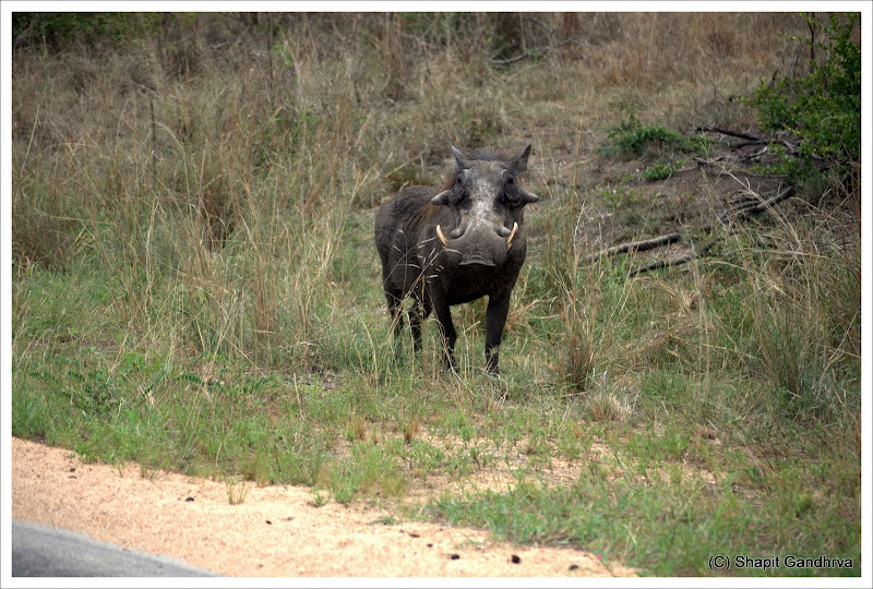 मग त्यांना तिथेच सोडुन पुढे निघालो तर एक रानडुक्कर आमच्या गाडिसमोरुन पळत जाऊन रस्त्याच्या दुसर्या बाजुला उभा राहिला. अशा अविर्भावात आमच्याकडे बघत होता जणु आम्हाला विचारत होता "तुम्हि माझ्या घरात काय करता आहात?"