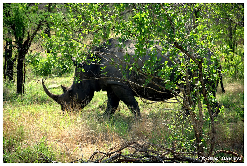 मागे घ्या.. आजुन मागे...ते बघा...तिकडे झाडित... आणि आम्हाला तो दिसला. बिग फाईव्ह मधला पहिला प्राणि... बिग बिग काळा गेंडा. आमच्या कडे लक्ष न देता आपल्याच मस्तीत चरतं होता.