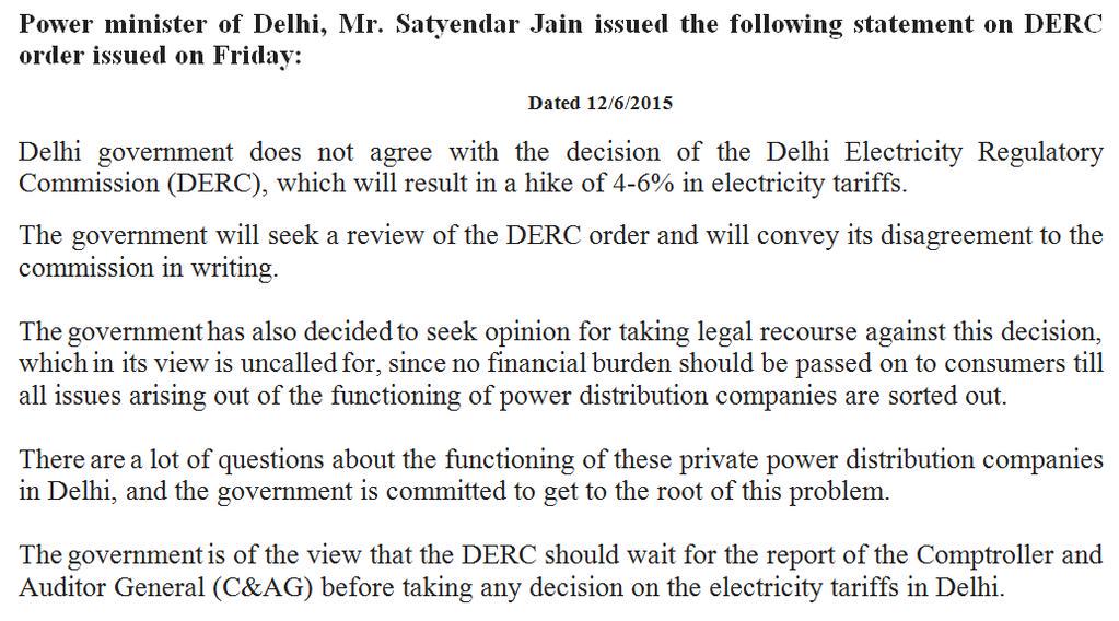 आता मिडियाने नवीन विषय घेतलाय. काल DERC ने दिल्लीत वीजदर ६% ने वाढवायची घोषणा केली आहे. दिल्लीसरकारला हे मान्य नाही.