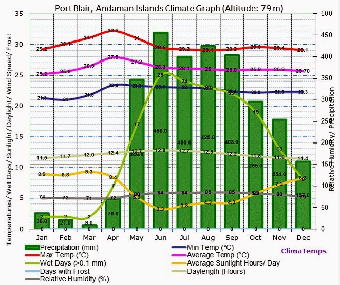 अंदमान द्विपसमूह भारताचे अविभाज्य अंग आहे. ही आपल्याकरता खरेच आनंदाची गोष्ट आहे. हिंदी महासागरास मिळालेले, हिंदी हे नामाभिधानही कदाचित, ह्याच आपल्या अस्तित्वाचे द्योतक असावे. मात्र, महासागरातील त्याच्या स्थानामुळे, अंदमान आणि निकोबार राज्यात, वर्षाचे बहुतांशी दिवस हवामान ढगाळ, वादळी आणि पावसाळी राहते. धूसर राहते. तापमान जरी मुंबईसारखेच असले तरी, हवामानातील महासमुद्री बेभरवसा, तिथे पुरेपूर भरून राहिलेला आहे. वर्षातले काही दिवसच तिथे वातावरण समेवर येते. निरभ्र वातावरण, स्वच्छ सूर्यप्रकाश आणि स्थिरपद, स्वस्थ समुद्र; स्वर्गसदृश हवामान प्रदान करतो. हेच दिवस तिथे पर्यटनास अत्यंत योग्य असतात. अशा दिवसात ज्यांनी तिथे पर्यटन केले, ते त्याची अविस्मरणीय गोडी, विसरूच शकत नाहीत. म्हणूनच अंदमानात पर्यटनास जातांना हवामान पक्षकर असायला हवे ह्यात तिळमात्र संशय नाही. एरव्ही, पर्यटनाचे अनेक दिवस खराब हवामानामुळे गमवावे लागलेले पर्यटक तिथे काही कमी नाहीत! संदर्भः http://www.andaman.climatemps.com/ वरील तक्ता स्वतःहूनच सारी हवामान परिस्थिती स्पष्ट करतो.