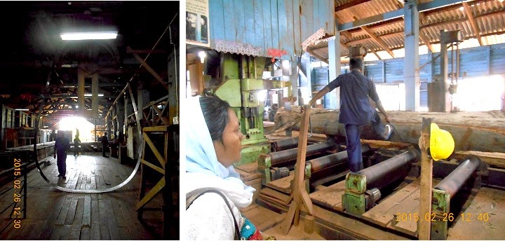 खालील पहिल्या चित्रात आरा यंत्राकरता, दातेरी आरीचा पट्टा उचलून नेला जात असलेला दिसत आहे. दुसर्या चित्रात कापले जाणारे पडौक वृक्षाचे लांबलचक खोड दिसते आहे.