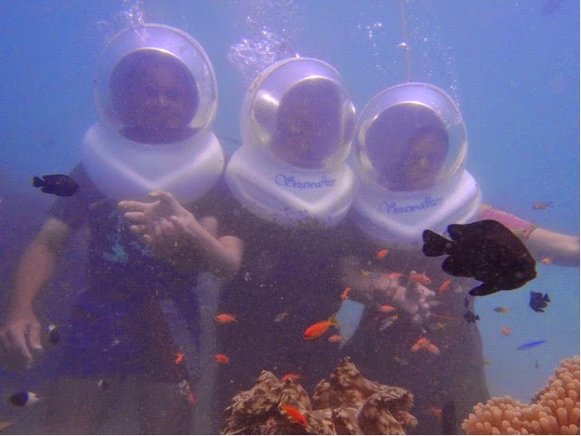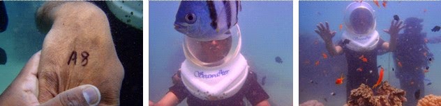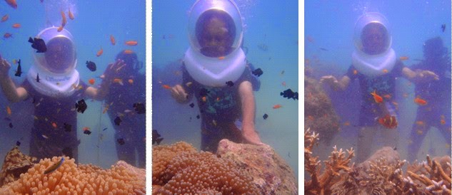 जहाजाच्या मागच्या बाजूला, साधारण जहाजाच्याच आकाराच्या गोलाकार समुद्राला, तरत्या गोलकांच्या आधारे, तळापर्यंत लोंबणारे जाळे लावून बंदिस्त केलेले आहे. जहाजावरून एक लोखंडी शिडी तळापर्यंत उतरवलेली आहे. तिच्यावरून समुद्राकडे पाठ करून, नेसत्या कपड्यांनिशी आपण दोन चार पायर्या उतरून तळाकडे निघालो, म्हणजे गळ्यापर्यंत पाण्यात शिरल्यावर, ३२ किलो वजनाचे हवेशीर, म्हणजे पाठीमागच्या बाजूने दाबित हवेची नळी जोडलेली असते असे, शिरस्त्राण आपल्या डोक्यावर चढवले जाते. जहाजावर एक मोठ्ठा हवादाबक (काँप्रेसर) असून त्यातून दाबित हवा आणणार्या सुमारे एक सेंटिमीटर व्यासाच्या लांबलचक (पन्नास, शंभर मीटर लांबीच्या असाव्यात) नळ्या शिरस्त्राणास जोडलेल्या असतात. अगदी चष्मा घालूनही हे शिरस्त्राण चढवले जाते. कारण शिरस्त्राणाच्या आतील भाग कोरडाच राहत असतो, शिवाय चष्मा घातल्याने आपण नेहमीसारखेच स्वच्छ पाहूही शकत असतो. शिरस्त्राणाचे आकारमान असे असते की, त्याचे पाण्यातील वजन केवळ ७ किलोच भरते. मात्र, ह्या ७ किलोच्या अतिरिक्त वजनामुळेही आपण सागरतळाकडे लोटले जाऊ लागतो. अशावेळी, सोबत करत असलेला पाणबुडा आपल्याला शिडी सोडायची खूण करतो आणि ती सोडताच आपण त्याचा हात धरून झपाट्याने सागरतळाशी पोहोचतो. इथे सागरतळ साधारणपणे ५ मीटर म्हणजे सुमारे १५ फूट खोल असतो. अर्थात हवेची नळी कायमच हवादाबकाला जोडलेली राहून आपल्याला दाबित हवेचा पुरवठा करत राहते. शिरस्त्राणाच्या आतील हवेच्या दाबाने बाहेरचे पाणी शिरस्त्राणामध्ये शिरू शकत नाही. आपण बाहेरच्यासारखाच सुखाने श्वासोच्छवास करत राहतो.