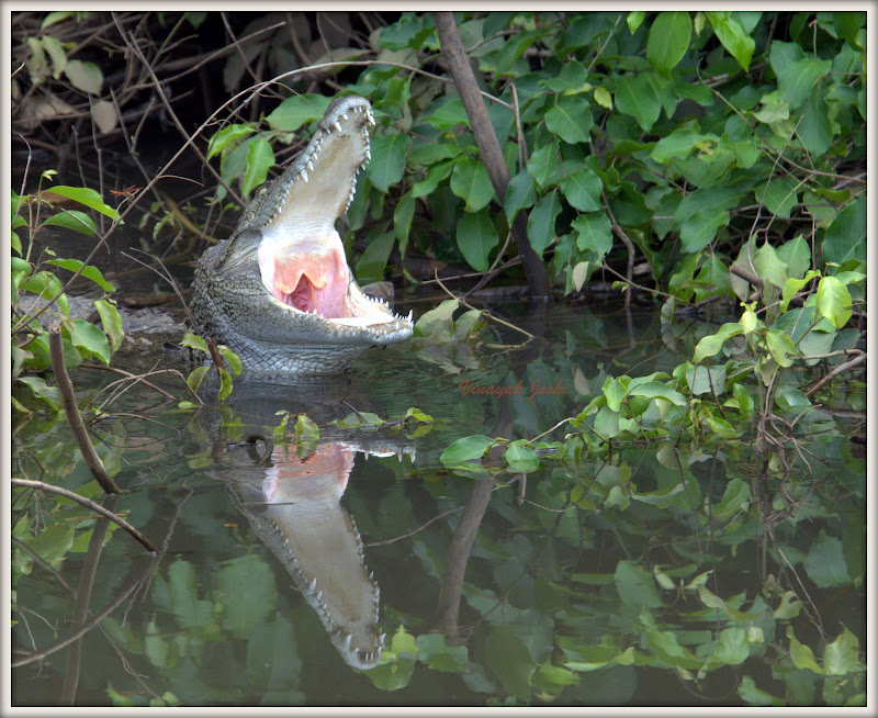 पोलादपुर मार्गे कोकणात चिपळुणपाशी पोचतानाच एक गाव आहे. तिथल्या तळ्यात मगरी दिसतात असे भाच्याने सांगीतले म्हणुन तिकडे मोर्चा वळवला. तळ्याकाठी चक्क Beware Crocodile Point अस बोर्डच दिसला. बघतो तर काय खाली चांगल्या ४-५ मगरी पहूडलेल्या होत्या. आम्ही कॅमेरे परजल्यावर एकीने लगेच आम्हाला दात वेंगाडुन दाखवले.
