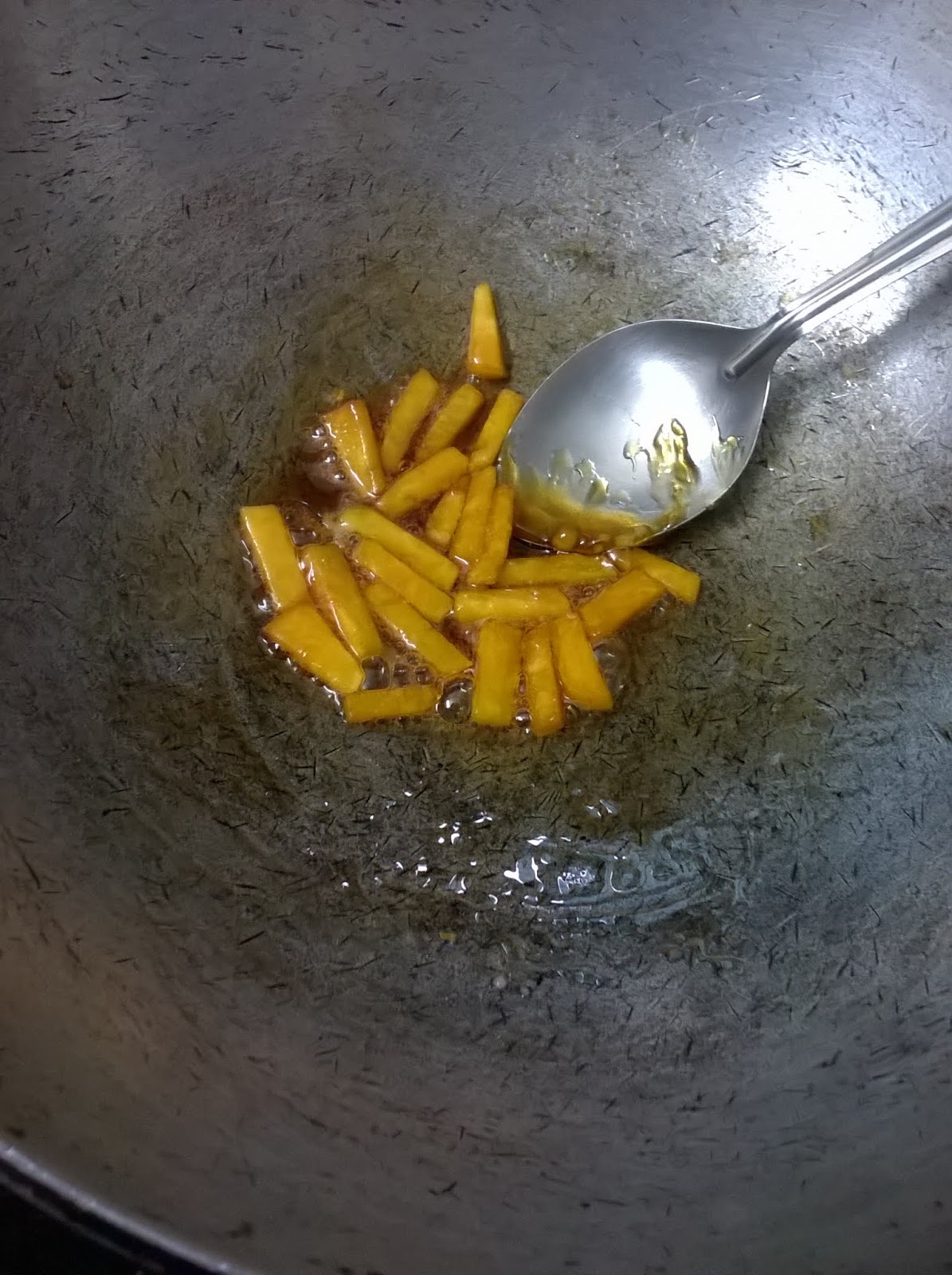 कढई तापवून थोडी साखर घालून वितळवून थोडे तांबूस पातळ कॅरमल केले.