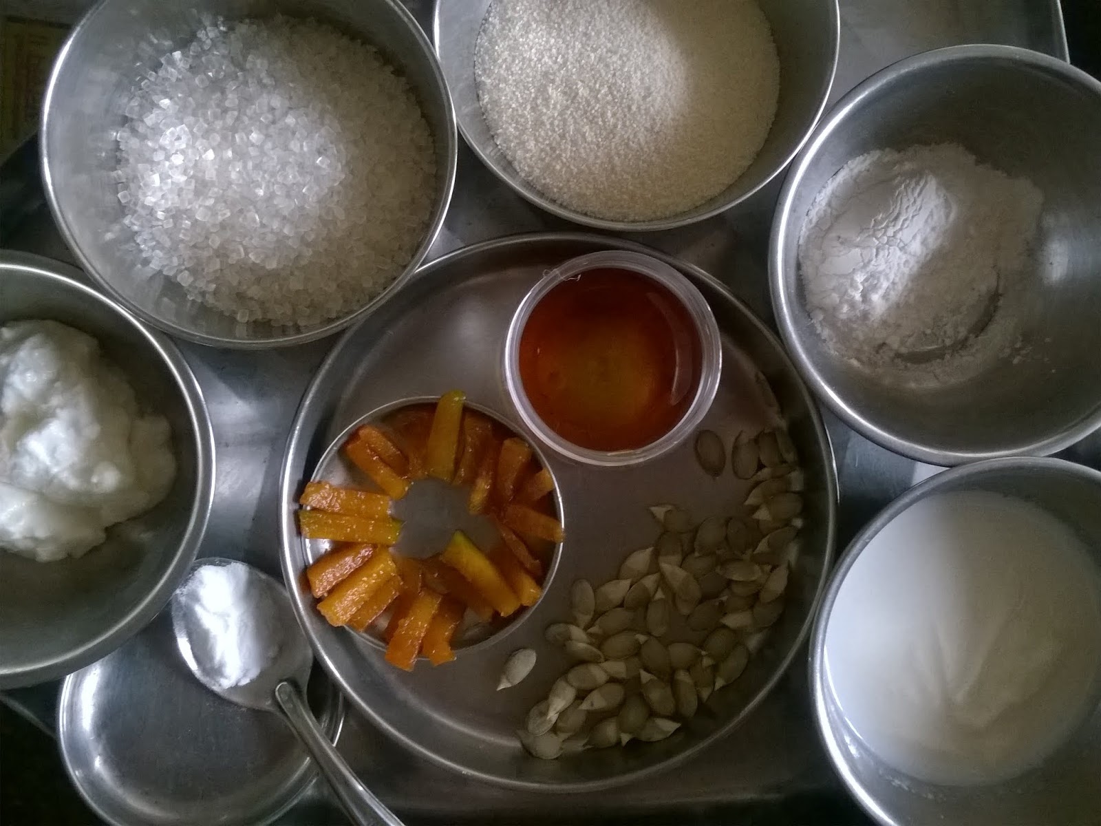 (बिन अंड्याचा रवा केक, लाल भोपळा वापरून.)