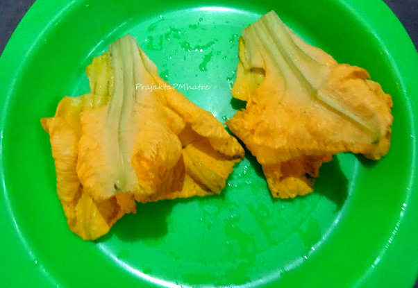 मी भोपळ्याच्या वेली लावल्या आहेत त्यावर रोज सुंदर पिवळी फुले फुलत असतात. अजून भोपळे लागले नाहीत व जी फुले येतात त्यांना भोपळे येणार नाहीत कारण येणार्या भोपळ्यावरच कळी येते. त्या एक दोन आहेत सध्या. तर अशी फुले सोडून रोज नुसती फुले खुप फुलतात. एक दिवस साधनाने ग्रुपवर एक सुंदर चायनिज व्हिडिओ टाकला. एक मुलगी परडी घेऊन शेतात जाते ताजी ताजी भोपळ्याची फुले काढुन परडीत टाकते. ती घरी आणते आणि धुवुन त्याची भजी बनवते. तो व्हिडिओ पाहिल्यापासून मला ती मुलगी व्हावेसे वाटू लागले आणि भोपळ्याची फुले मला रोज खुणावू लागली. एका शनीवारी सुट्टीत शेवटी मी ती मुलगी बनण्याचे ठरविले आणि तिच्यासारखी सुंदर परडी तर नव्हती माझ्याकडे पण घरातली एक प्लास्टीकची टोपली घेतली आणि निघाले फुले काढायला. मनात व्हिडिओतली म्युझिक वाजत होती व जणू त्या तालावर मी नाजूकपणे ती फुले खुडली. रेसिपी लिहायचीच होती व त्या फुलांना सोशल मिडीयावर सुप्रसिद्ध करण्याच्या हेतूने फोटो काढले.