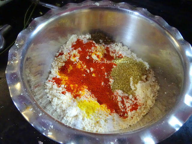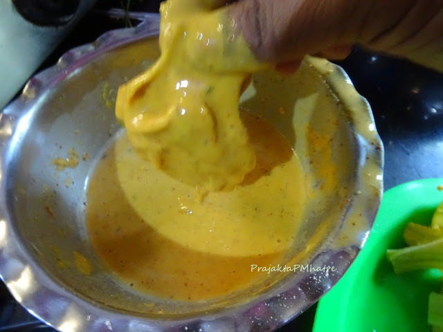 एका वाडग्यात थोडे बेसनचे पीठ, चिमुटभर हिंग, अर्धा चमचा हळद, अर्धा चमचा मिरची पूड, अर्धा चमचा धणा पावडर व चवीनुसार मिठ घेऊन पाणी घालून ते जाडसर एकत्र कालवून भिजवून घेतल .