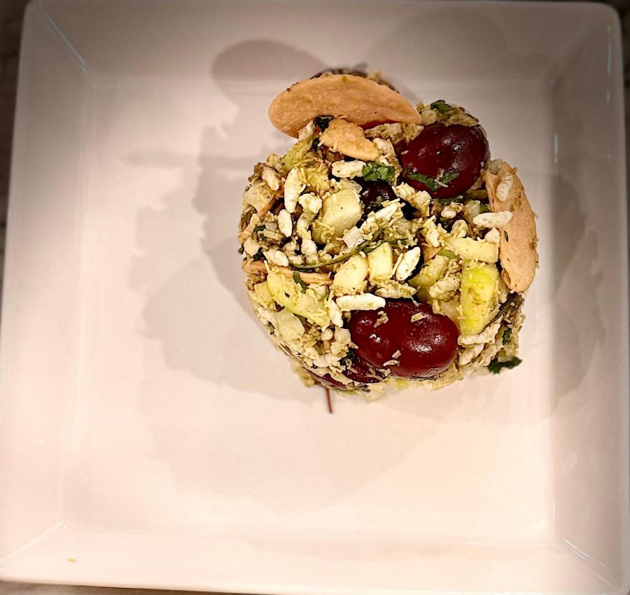 तर ह्यात द्राक्षं आणि कच्ची कैरी अशी दोन फळं वापरली आहेत. बाकी चुरमुरे, बारीक चिरलेला कांदा, हिरवी मिरची, कोथिंबीर, शेव, पुर्या, गोड आणि तिखट चटणी वगैरेही आहेतच.