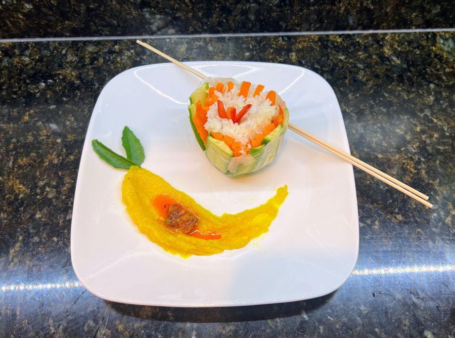 एशियन पदार्थांसाठी वापरतात तो राइस पेपर वापरून भात आणि कापलेल्या सॅलड ची रचना केली, त्याचा रोल केला , तसाच प्रेझेन्ट करण्याचा विचार होता पण तो रोल जरा जाडा जुडा झाल्यामुळे छान दिसेना! मग अर्धा कापून फुलासदृश आकार दिला झालं